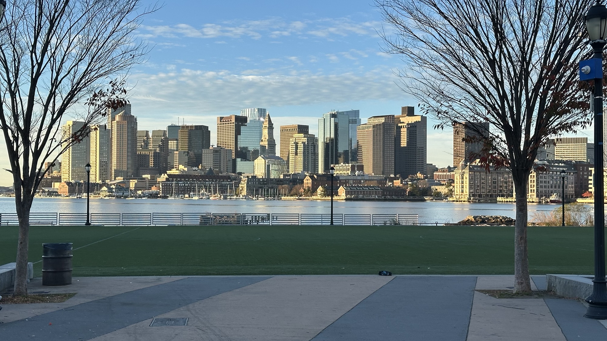 View of Boston from across the harbor in East Boston. They’ve got a beautiful series of parks all along the harbor here. Some athletic fields as well.