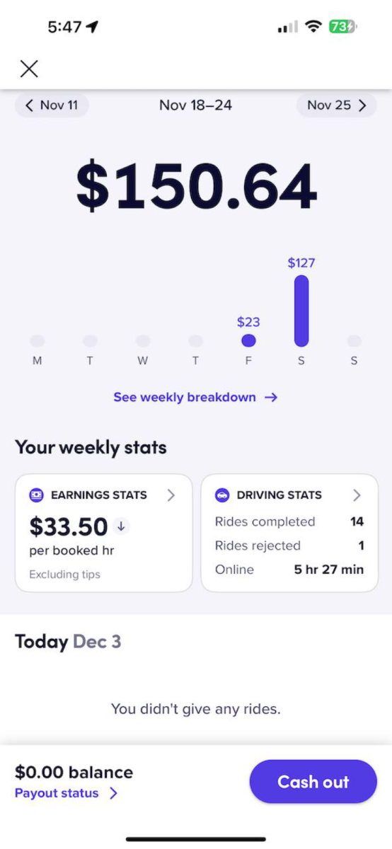 *Drivers also have the option to “cash out” anytime using the button at the bottom of the app. Both rideshare platforms offer programs to support drivers without a car or immediate cash, functioning like an ATM when needed.