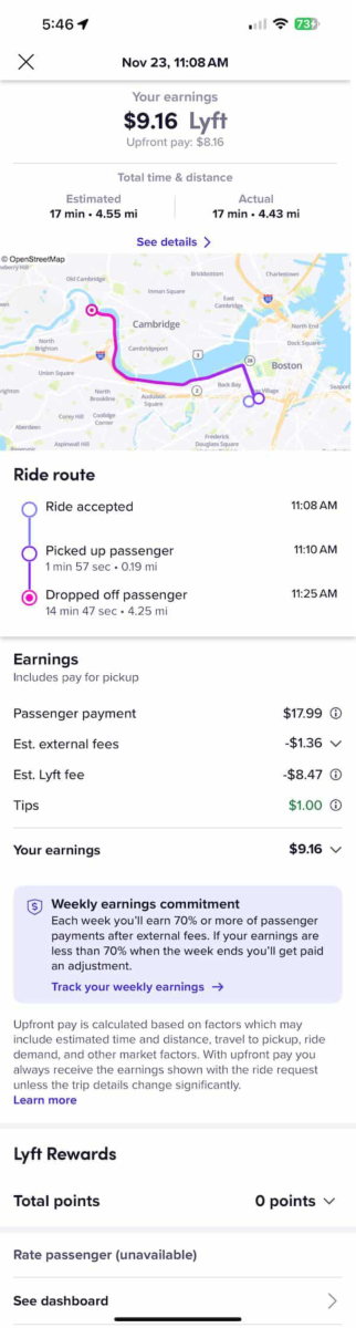 To the left is Screenshot #4, which outlines earnings and deductions. For this specific ride, a Lyft fee of $8.47 is shown. The trip covered a distance of 4.43 miles, taking 17 minutes, from Berkeley Street westward along Storrow Drive to Cambridge. No tolls were involved. So, what could justify this fee? Is it consistent across all passengers? Why don’t similar rides incur identical fees? Lyft provides an explanation of their fee structure at the bottom of the graphic.