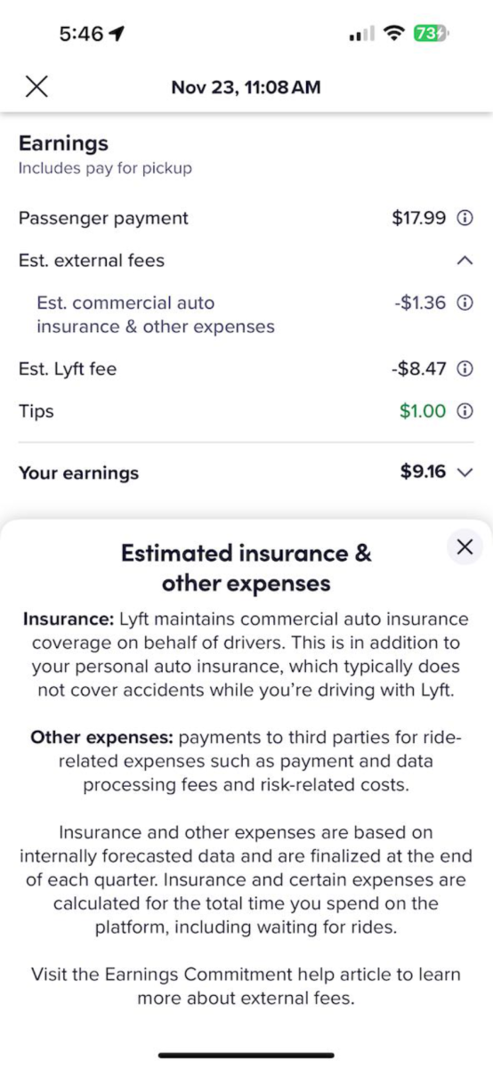 Lyft mentions a notable point. Insurance costs are based on “the total time you spend on the platform, including waiting for rides.” In this example, the external fee is only $1.36.