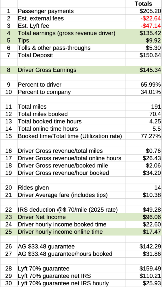 - Line 25: Driver’s net hourly income after auto expenses for all hours online was $17.47.
