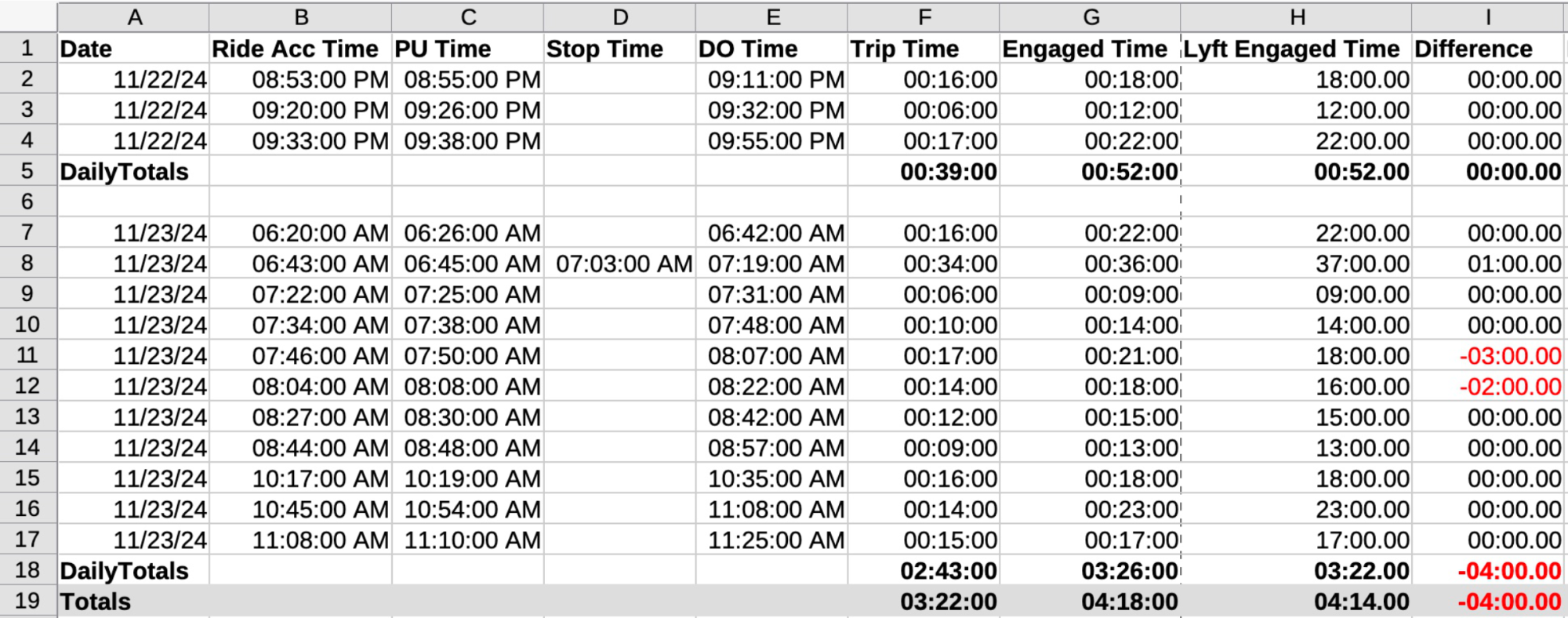 - Difference: The variance between the calculated Engaged Time and the Lyft-reported Engaged Time.