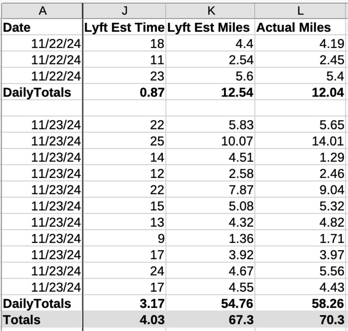 - Lyft Engaged Time: The engagement time reported by Lyft. This figure does not always match the calculated Engaged Time and originates from Lyft’s system. This discrepancy will be discussed further.