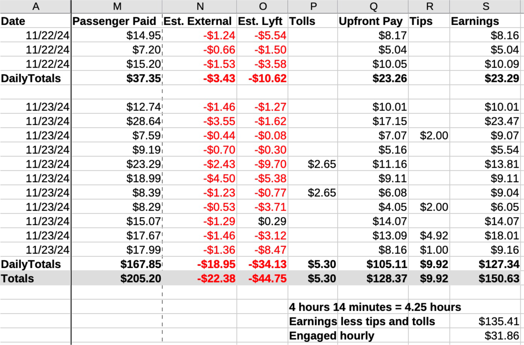 - Passenger payments: from Lyft receipt. This is what passengers paid to Lyft. Details with screenshot below.