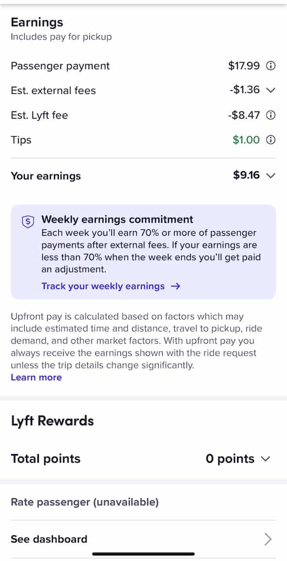 - Est. Lyft: The “Estimated Lyft Fees,” described as costs for maintaining the platform, investing in ridership growth, and improving the app. Under certain circumstances, this figure may appear as a positive number. Additional details follow.