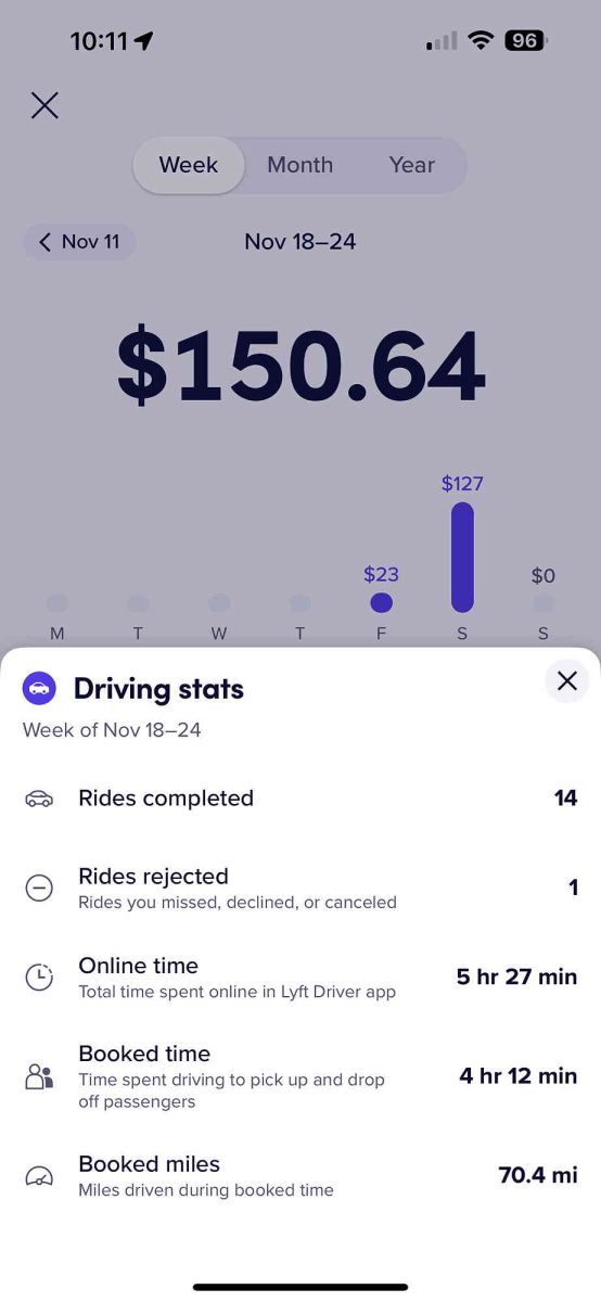 Driving Stats show that the driver completed 14 rides and declined or rejected 1. The total online time was 5 hours and 27 minutes. What about engaged time? That information is found on another screen, which we’ll discuss later. It’s worth noting that “booked hour” and “engaged time” are often used interchangeably.