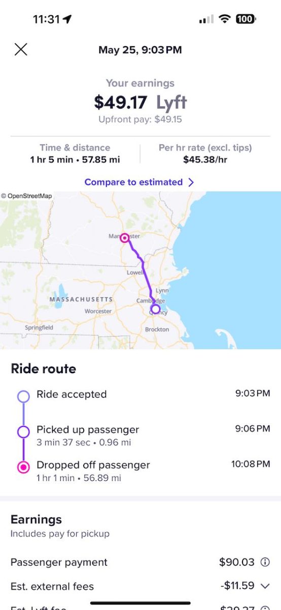 This is a receipt from a Lyft ride from Quincy, MA to Manchester, NH. The driver was paid $49.17 while the customer paid $90.03. How does that happen? The business is not based on time and distance. There is no longer a rate card for either a driver or a customer to verify the cost. The customer will be charged as much as the rideshare company thinks they can get. The driver will be paid as little as the rideshare company thinks they can pay.
