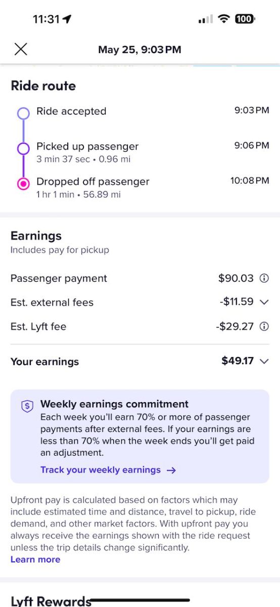 The problem with this is that it’s a 2 week average and it’s based on “Engaged time”. You can see from this example that engaged time is only about half of the total time. This particular job will be averaged into 2 weeks worth of jobs. In this case it works out for Lyft as the driver made $49.17 in a little over 1 hour. The problem is the dead miles after and that is the driver’s problem.